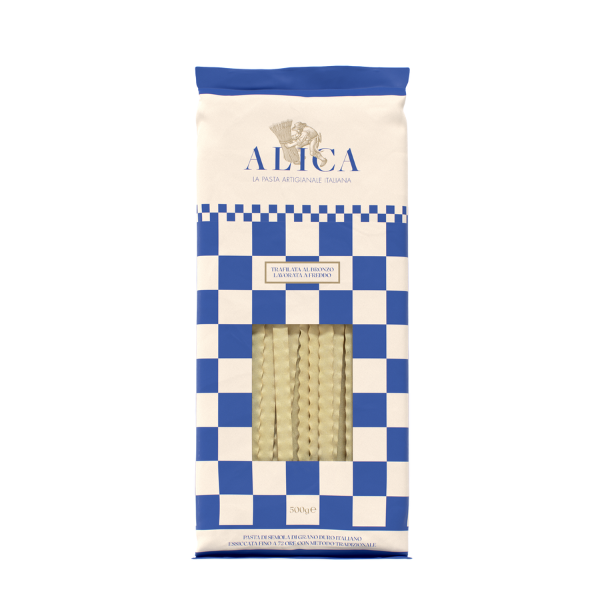 Confezione da 1 pacco singolo da 500gr di Mafalde Alica prodotti con grani selezionati 100% italiani, trafilati al bronzo a bassa temperatura per conservare intatti tutti i valori nutrizionali e le proteine salutari del grano duro. Pensate per catturare al meglio il condimento, come per esempio un corposo ragù.