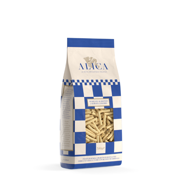 Confezione da 1 pacco singolo da 500gr di Sedani rigati Alica prodotti con grani selezionati 100% italiani, trafilati al bronzo a bassa temperatura per conservare intatti tutti i valori nutrizionali e le proteine salutari del grano duro. Pensati per catturare al meglio il condimento.